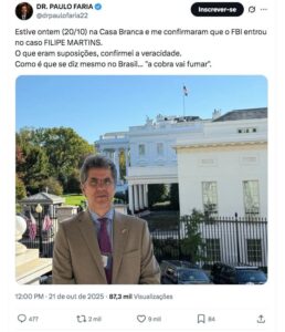 – Estive ontem (20/10) na Casa Branca e me confirmaram que o FBI entrou no caso FILIPE MARTINS. O que eram suposições, confirmei a veracidade. Como é que se diz mesmo no Brasil… “a cobra vai fumar” – escreveu Faria, na rede social X.