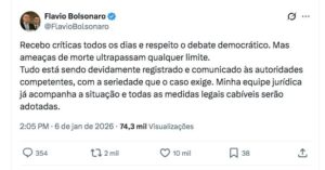 Nesta terça-feira (6), o senador e pré-candidato à Presidência, Flávio Bolsonaro (PL-RJ), usou as redes sociais para revelar que recebeu ameaças de morte. Ele destacou que “tudo está sendo devidamente registrado e comunicado às autoridades competentes”.